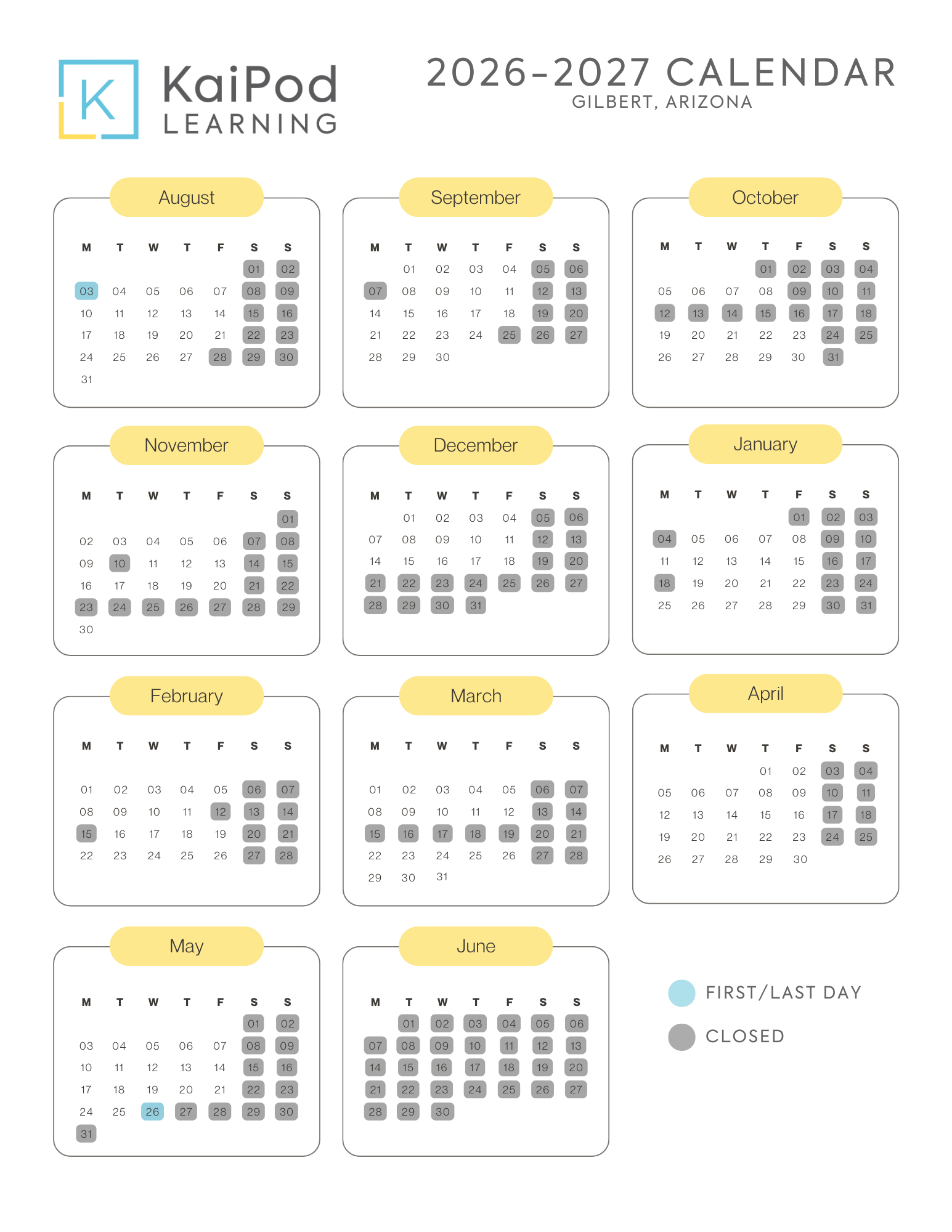 At KaiPod Learning, we recognize that all students are unique and learn in different ways. Thus, we are committed to giving students the flexibility they need to maximize their learning experience. For this reason, KaiPod Learning operates on an “open door” basis. Each student may come as frequently or infrequently as they wish based on their enrolled plan. Students may come for a whole day, a partial day, or for various brief intervals throughout the course of a single day. It’s your choice. We are here to offer support when and if your student needs it.Standard Enrollment Days