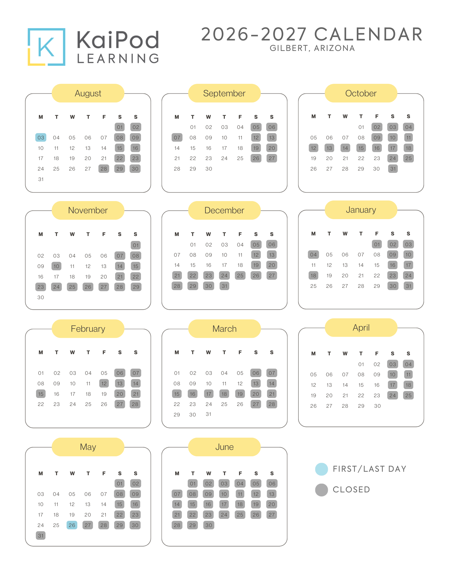 Due to KaiPod Learning’s Open Door Policy, families are charged their selected payment plan fee regardless of student attendance. As such, no credits, prorated discounts, makeup days, or refunds are provided for sick days, missed days, vacation days, calendar holidays, or half-days.