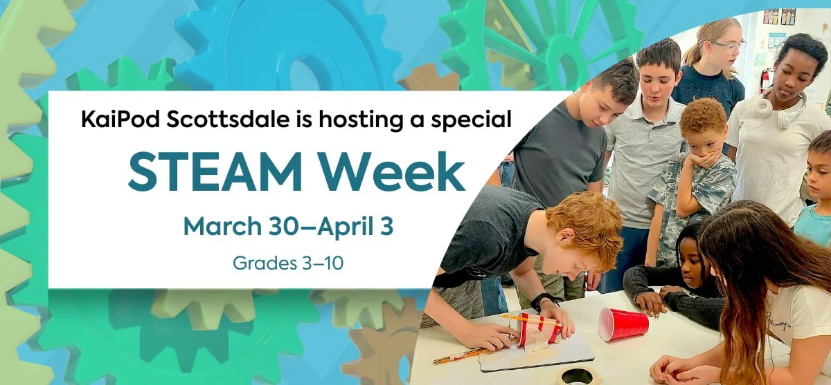 We’re inviting local families to let their child experience KaiPod Scottsdale at no cost during a special STEAM-themed week, March 30–April 3. Students in grades 3–10 can join us for one or more afternoons of hands-on learning in a small-group setting.