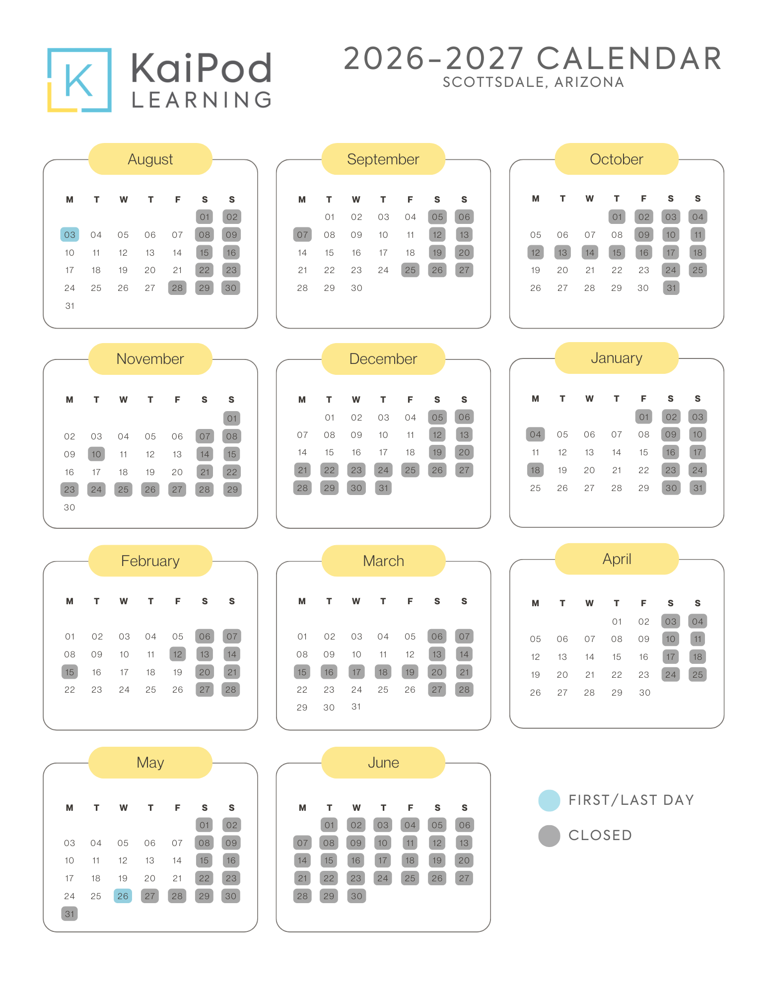 Due to KaiPod Learning’s Open Door Policy, families are charged their selected payment plan fee regardless of student attendance. As such, no credits, prorated discounts, makeup days, or refunds are provided for sick days, missed days, vacation days, calendar holidays, or half-days.