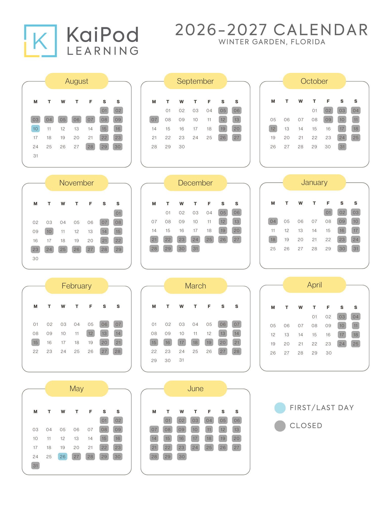 At KaiPod Learning, we recognize that all students are unique and learn in different ways. Thus, we are committed to giving students the flexibility they need to maximize their learning experience. For this reason, KaiPod Learning operates on an “open door” basis. Each student may come as frequently or infrequently as they wish based on their enrolled plan. Students may come for a whole day, a partial day, or for various brief intervals throughout the course of a single day. It’s your choice. We are here to offer support when and if your student needs it.Standard Enrollment Days